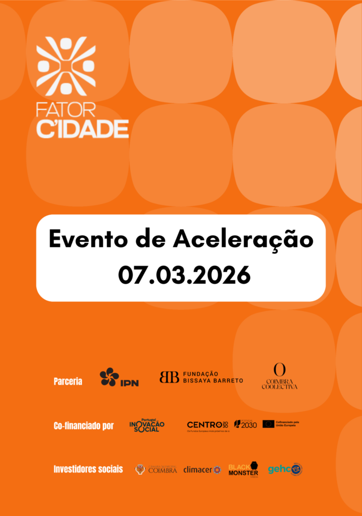 A 2.ª edição do Fator C’Idade, promovido pelo Instituto Pedro Nunes, pela Fundação Bissaya Barreto e pela Coimbra Coolectiva, terá início no dia 7 de março, com a realização do Evento de Aceleração, que decorrerá entre as 10h00 e as 17h30, na Fundação Bissaya Barreto – Campus do Conhecimento e da Cidadania, em Bencanta, Coimbra.